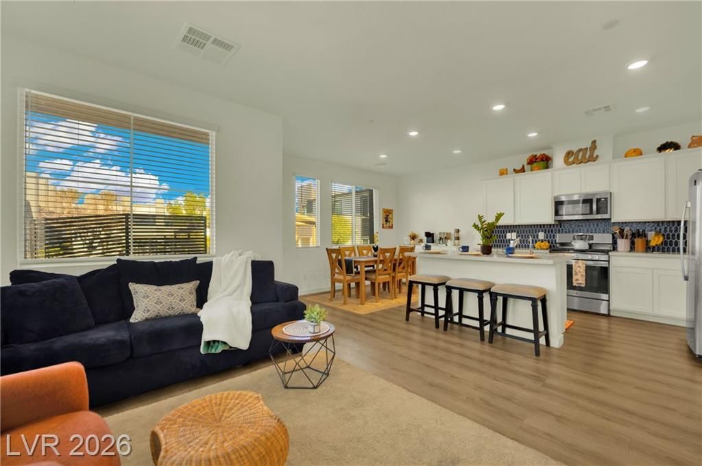 Steps away from vibrant Water Street District. Featuring restaurants, coffee, shops, wine bars, Ice skating rink, shops and events like Parades and Farmers Markets.This stunning 4-bed, 3-bath Lennar townhome is just under 2 years old. This home offers modern luxury with fully upgraded interiors, including luxury vinyl plank flooring throughout. The gourmet kitchen boasts a new custom backsplash, stainless steel appliances, and a spacious breakfast bar. A versatile loft space is also included. Downstairs bedroom with 3/4 bathroom. Enjoy picturesque green views as the property is situated directly across from a community park. Experience the ultimate urban lifestyle: walk to dining, shopping, coffee shops, farmers' markets, parades, and the ice skating rink. This rare property features a 2-car attached garage and seamlessly blends park-front tranquility with the excitement of Henderson's premier revitalization area.Home comes with a 3 year Home Warranty.